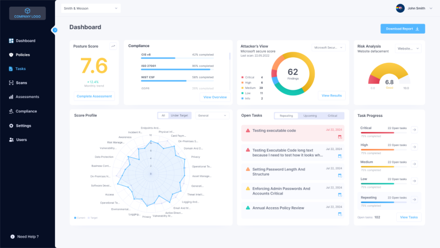 - Centralized Data Aggregation: The platform automatically pulls data from assessments, remediation progress, and compliance tracking into a unified dashboard.
