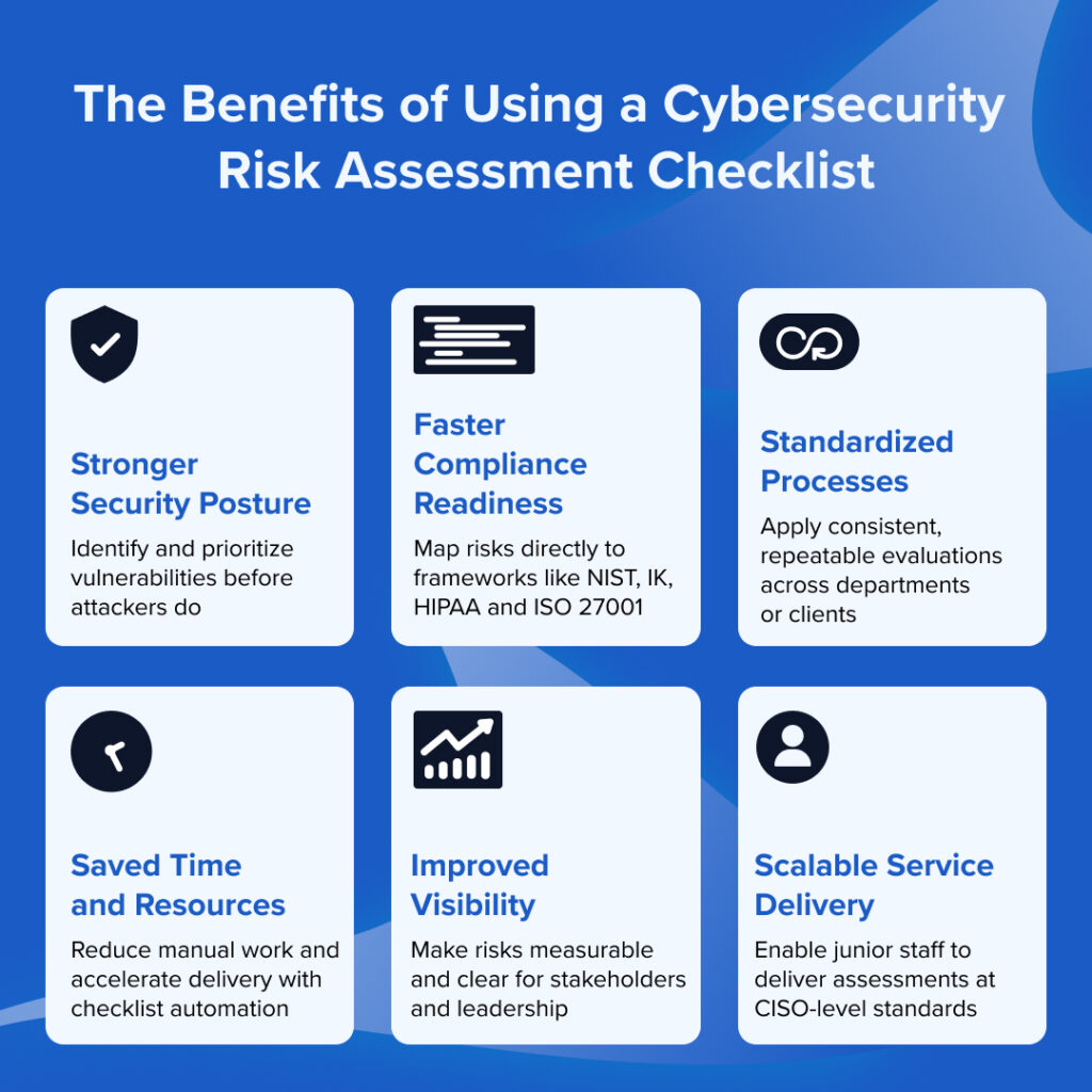 The benefits are clear: cybersecurity risk assessment checklists streamline documentation, accelerate compliance readiness, and help organizations build a stronger, more resilient security posture. They also support scalable, standardized delivery across teams or clients, and improve both internal collaboration and client-facing communication.