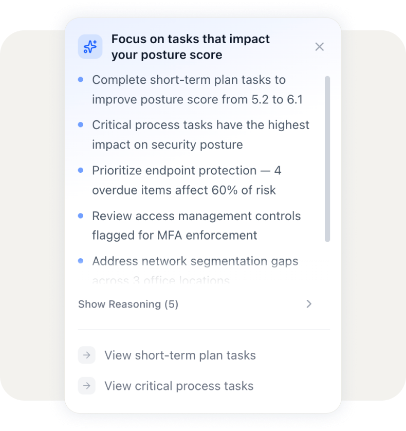 CISO Intelligence is Cynomi’s embedded security leadership layer, built into its AI Agent infrastructure and guided workflows. It goes beyond automation and checklists by helping MSPs and vCISO teams deliver consistent, expert-level guidance across every client without adding headcount.