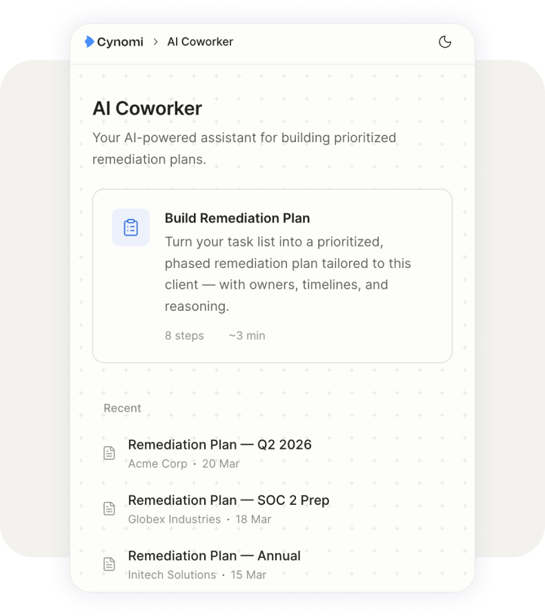 Most platforms use “AI-powered” to describe basic automation — auto-filling forms, generating summaries, or organizing checklists. Cynomi’s AI is a multi-agent system where purpose-built agents each contribute distinct expertise to every deliverable. The platform doesn’t just assist, — it produces finished, client-ready outputs backed by expert-level reasoning. Every recommendation includes its “why.”