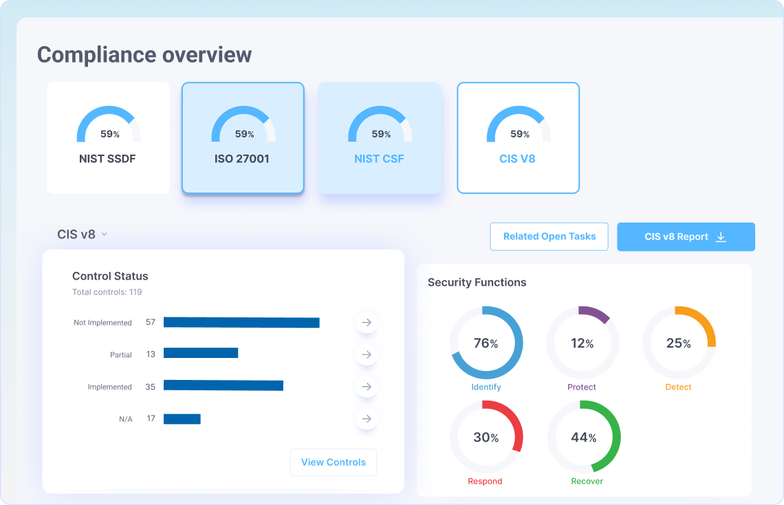 - Continuously monitor compliance readiness with auto-updating tasks and metrics that adapt to evolving frameworks