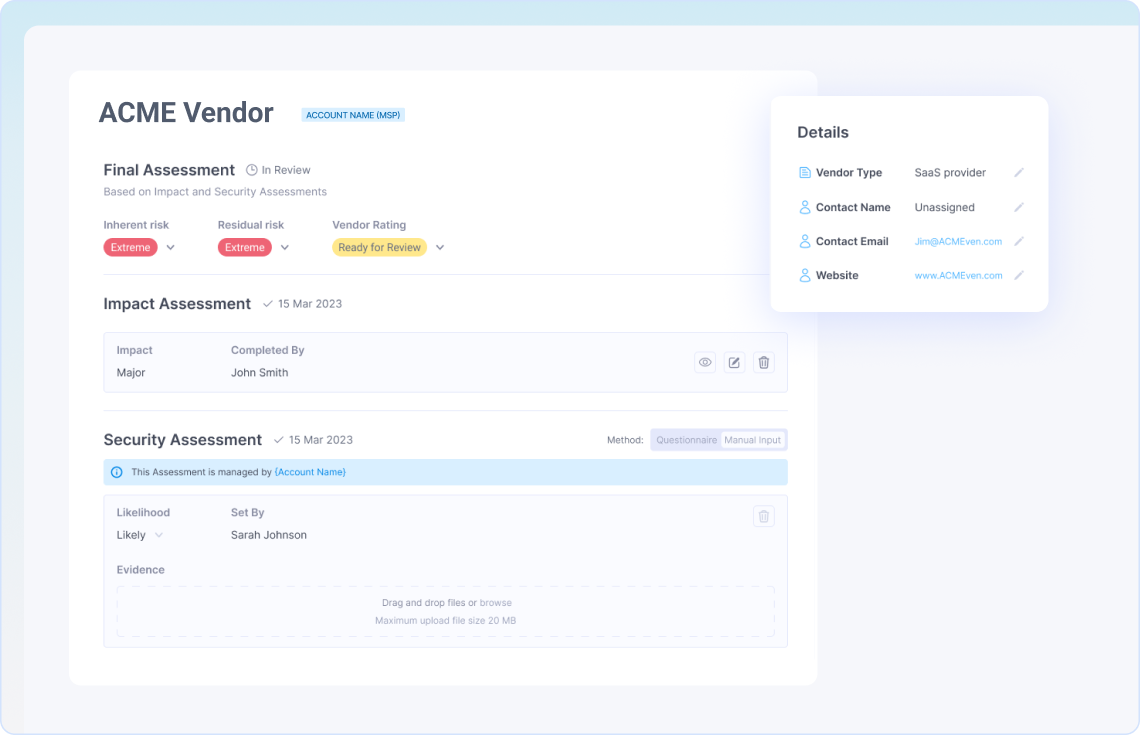 - Upload and evaluate vendor documentation like SOC 2 and ISO 27001 to inform risk scoring