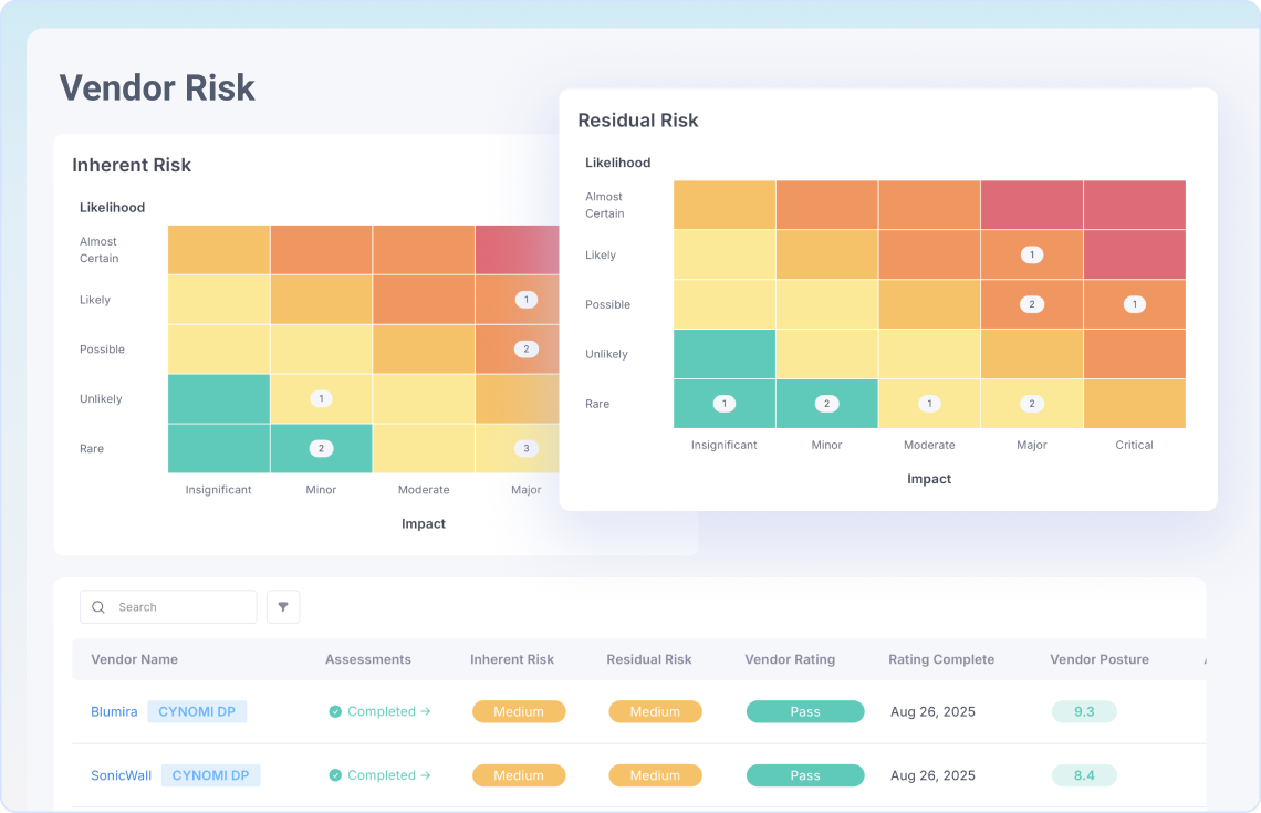 - Get a final vendor risk score based on a standardized formula (Impact × Likelihood)